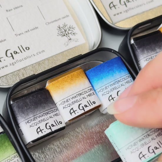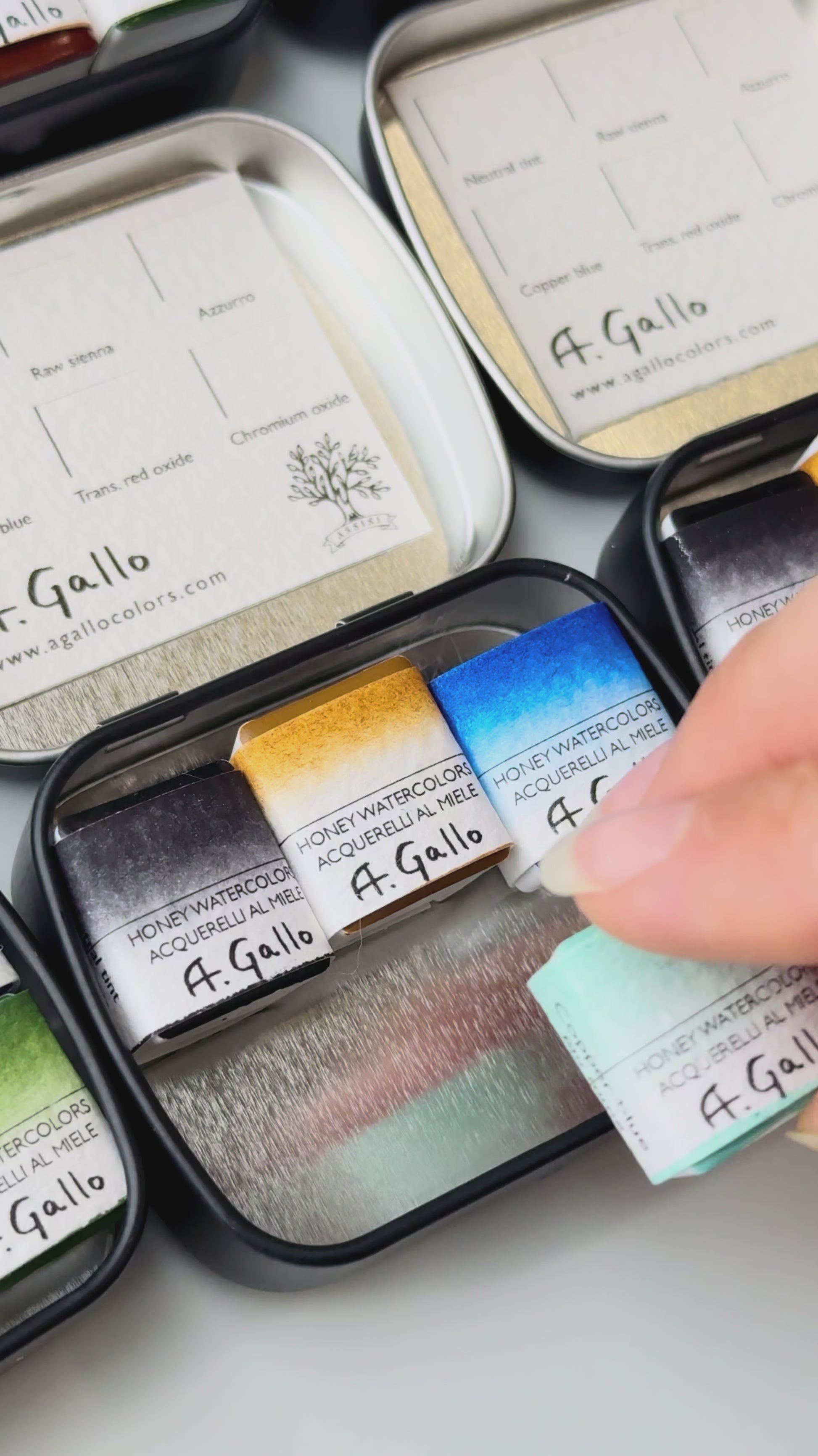 Akvarellfärger i halvkopp, inslaget i ett handmålat akvarellpapper med motsvarande kulör.