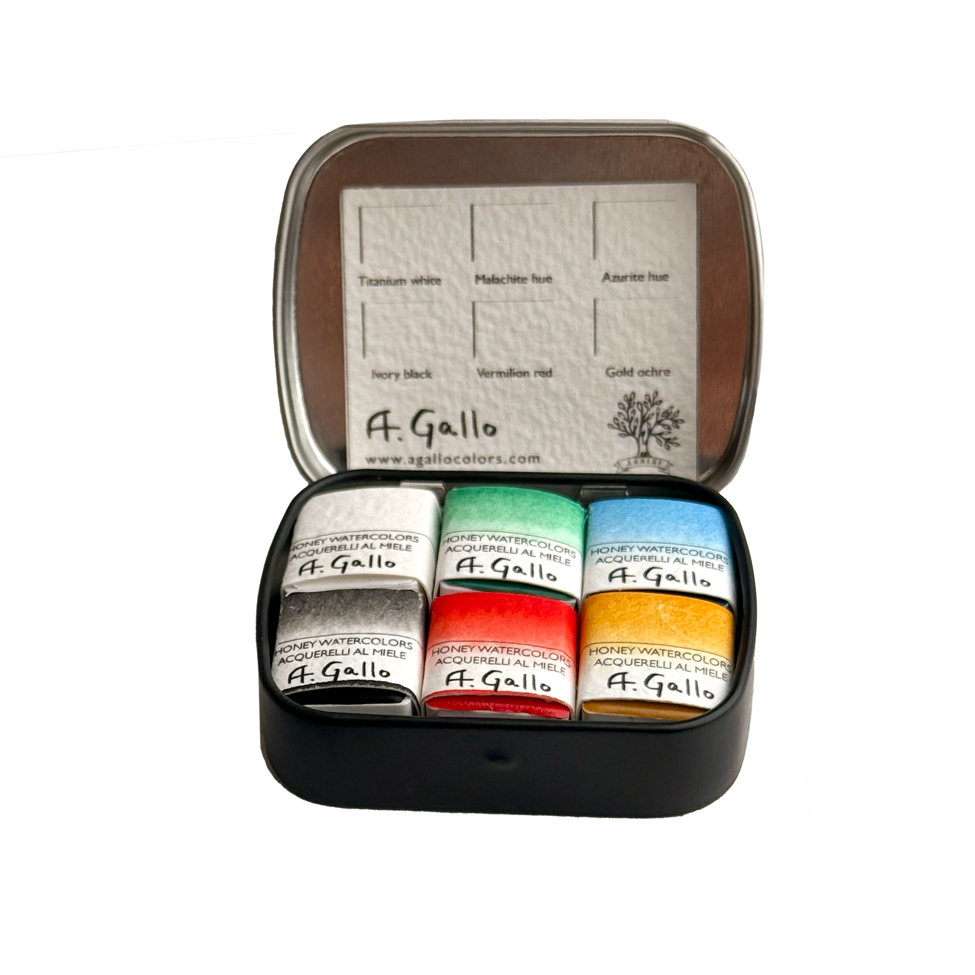 Färgerna innehåller rena pigment, gummi arabicum, honung, oxgalla och eterisk olja av rosmarin.