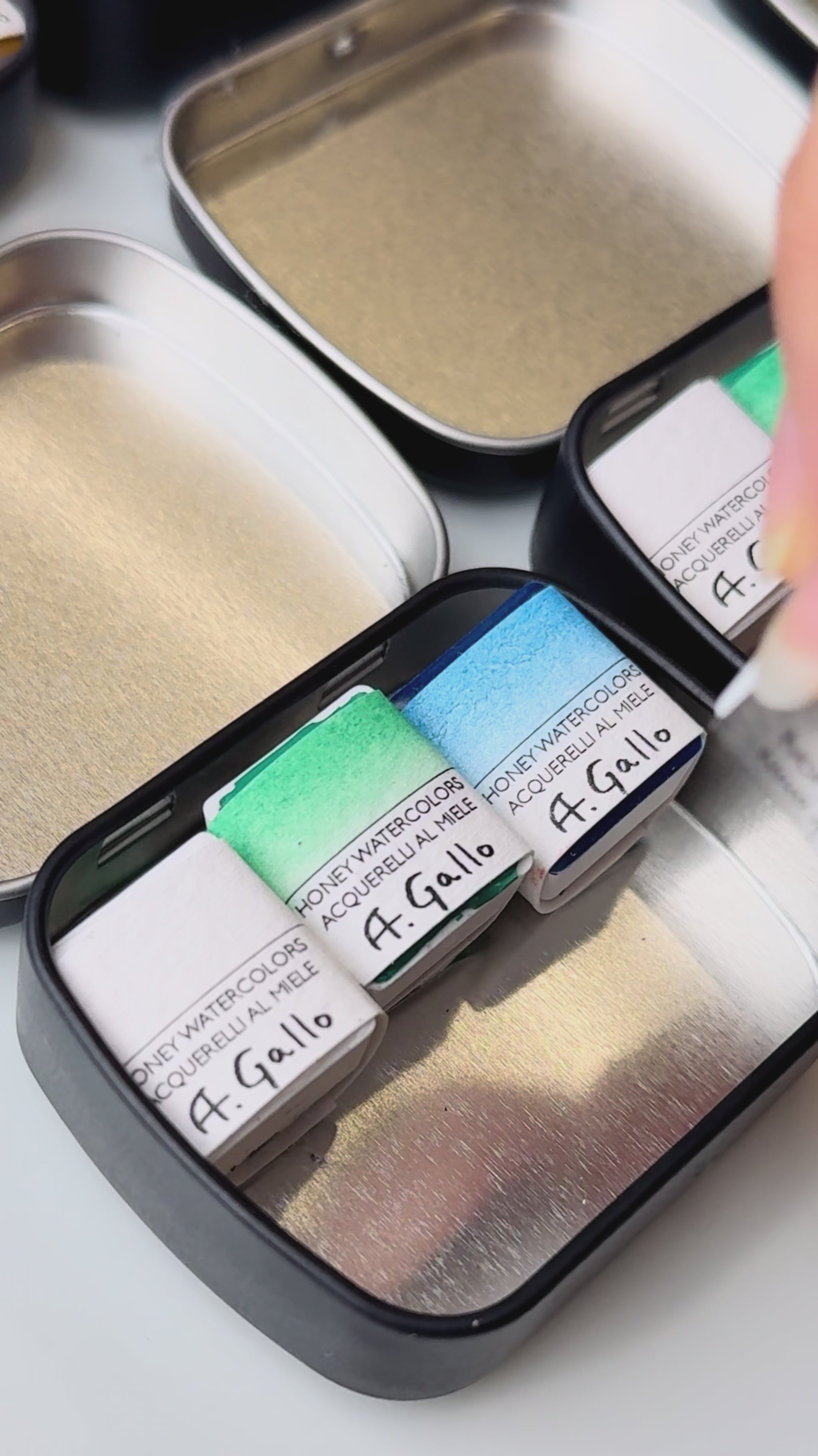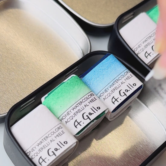 Akvarellfärger i halvkopp, inslaget i ett handmålat akvarellpapper med motsvarande kulör.