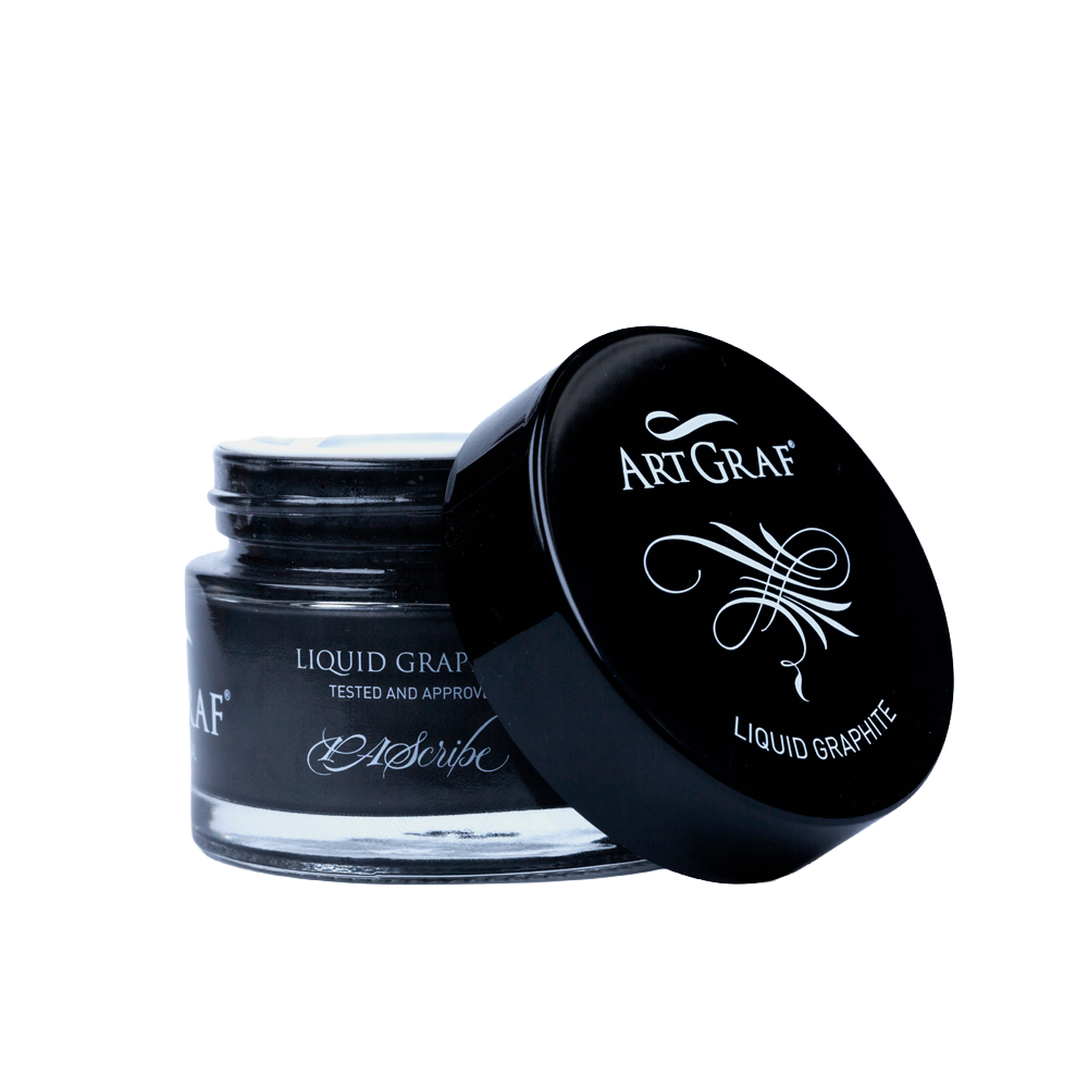 Flytande grafit från ArtGraf är en vattenlöslig flytande vätska, lik tusch, med hög koncentration av pigment som har en blyaktig ton. Spädas med vatten och kan skapa en mängd olika texturer, framförallt skapa exakta och definierade linjer. Lämplig för användning på vita, svarta och färgat papper. Använt doppenna eller pensel, passar teckning, måleri, kalligrafi, etc.