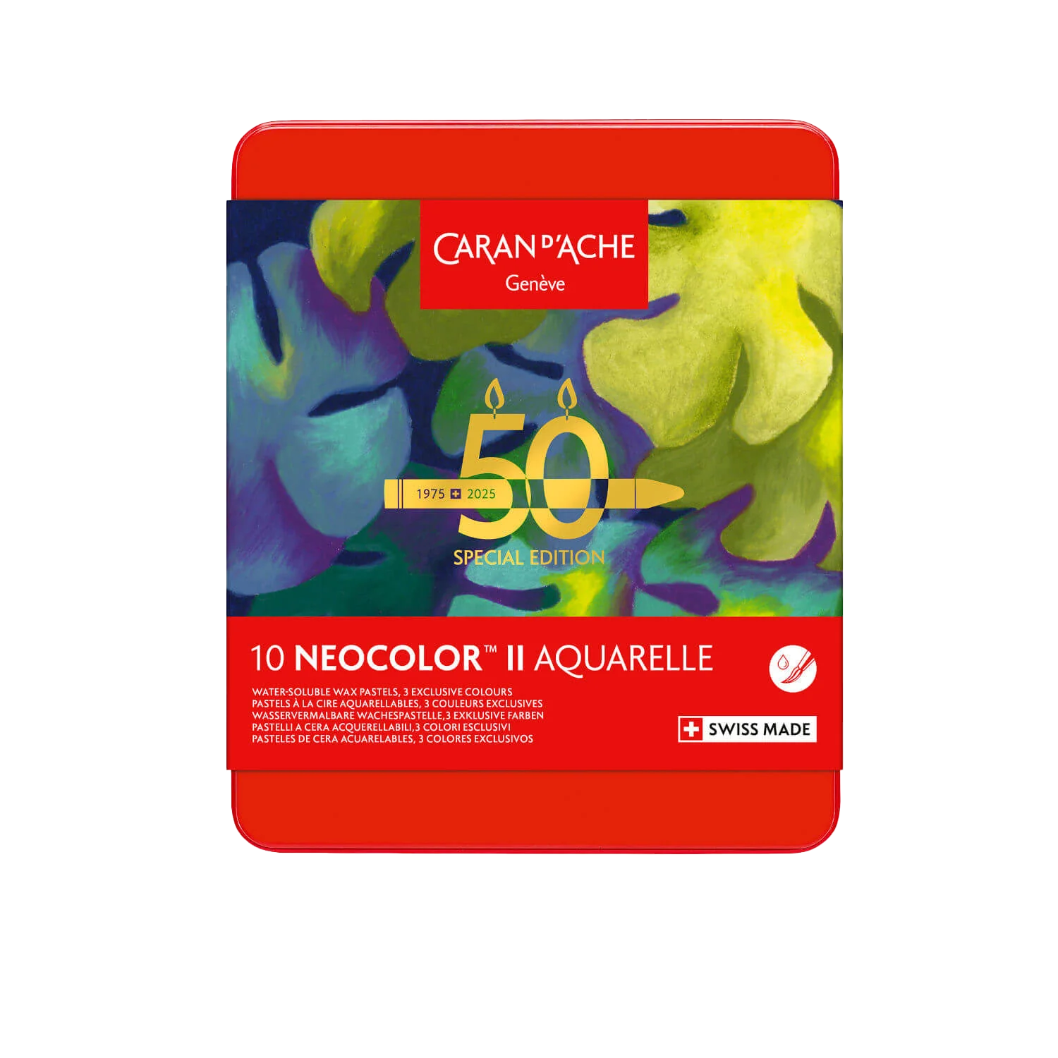 Caran d’Ache Neocolor® II akvarellkritor firar sitt 50-årsjubileum med fem specialutgåvor, berikade med 15 exklusiva färger, grupperade i tematiska paletter: Pop, Lush, Portrait, Pastel och Dark. Varje metalletui innehåller 10 akvarellkritor varav tre av de 15 nya nyanserna.