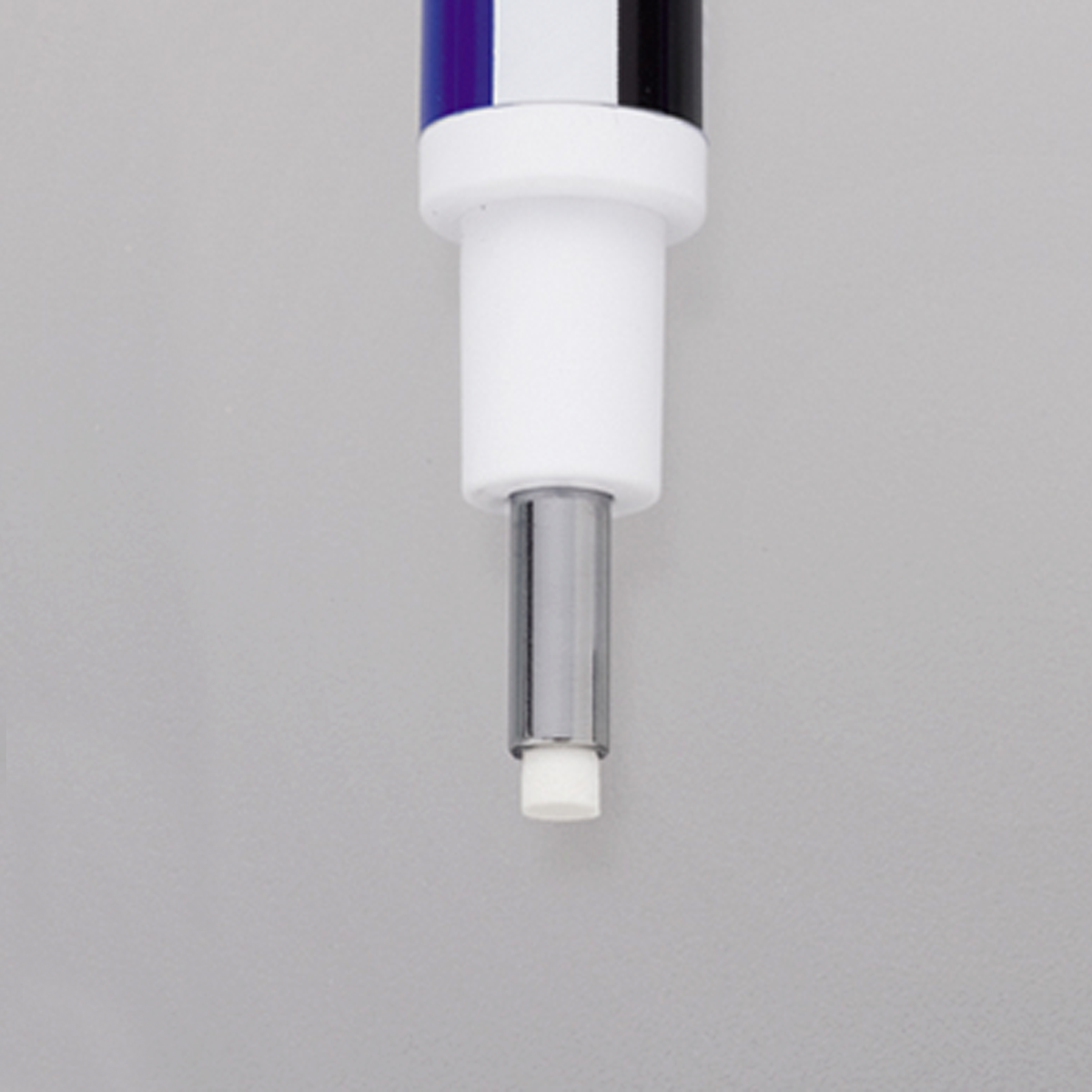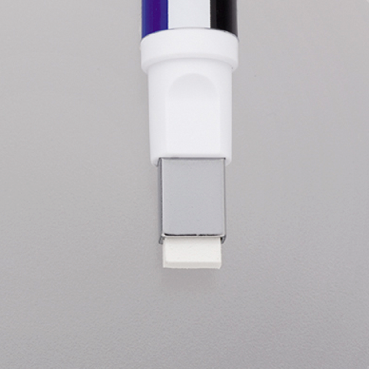 Raderpennan är ungefär 12 cm lång, har en kort tryckmekanismort tryckmekanism, frammatningssystem av metall och är försedd med clips. Den har en lång metallspets som förhindrar att radergummit bryts. Tippen är rund, Ø 2,3 mm, eller platt, bredd 2,5x5mm. Reserverna kommer 2 stycken/tub.